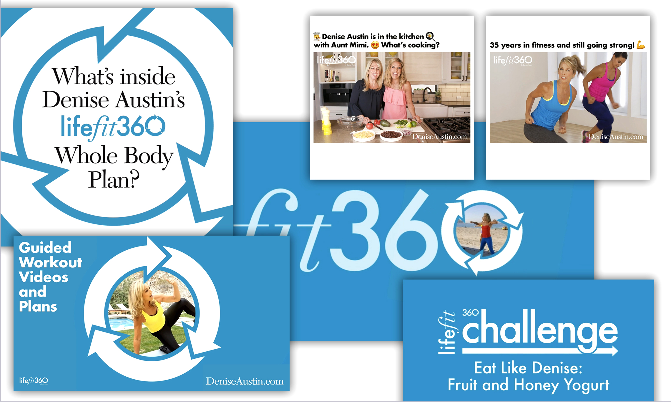Fitness guru Denise Austin's energy and zeal are best captured in video. Her dynamic content is always engaging, so the supporting assets need to follow suit. After I designed the "360" portion of her new LifeFit360 series, animating the arrows in the "0" was the most obvious next direction. That technique was then applied in various ways to the new campaign, along with some whimsical social media videos.