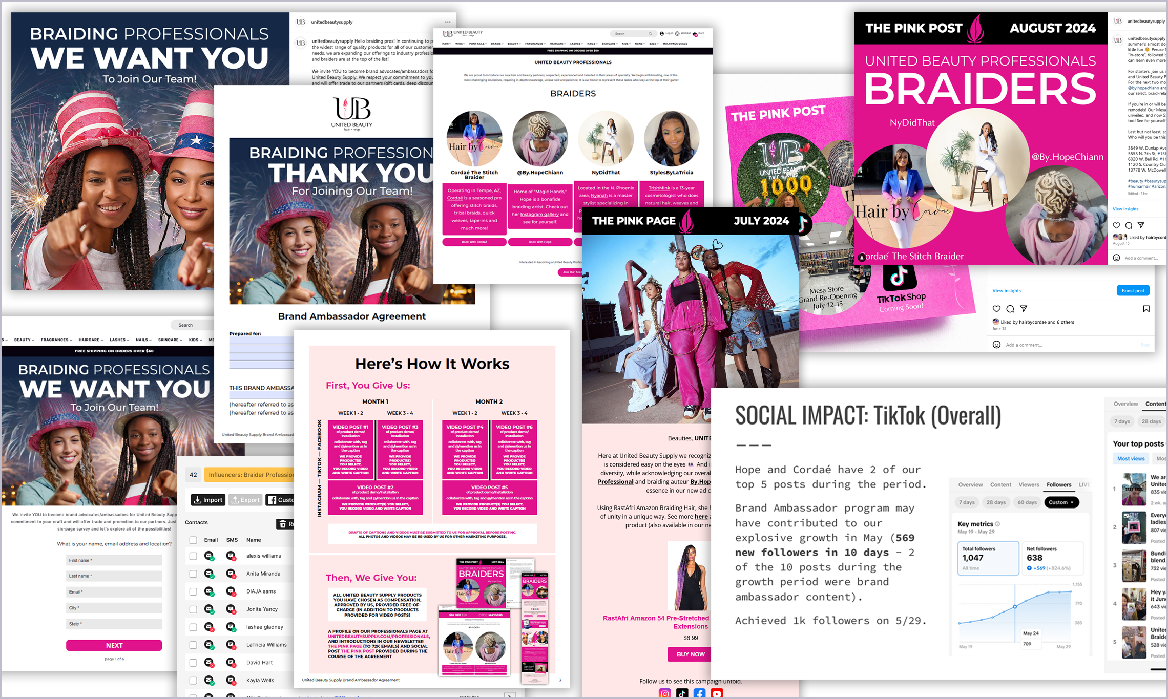 In taking ownership I drafted agreements outlining requirements and customized each contract based on the brand partner's strengths. Ambassadors received product compensation and notoriety in special customer communications (United Beauty Professionals landing page, The Pink Page email newsletter and The Pink Post on social platforms) in return for their efforts. The program has since spawned a series of livestreamed events, LIVE Installs on Location.